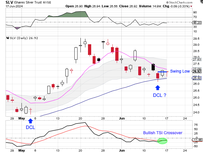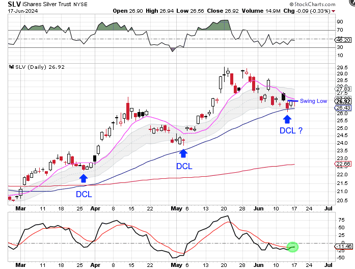 Silver is currently being squeezed by the declining 10 day MA and rising 50 day MA. Silver is also in a daily uptrend. A close back above the 10 day MA will indicate a continuation of its daily uptrend and signal a cycle band buy signal.