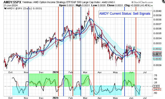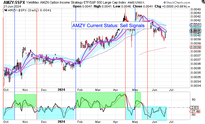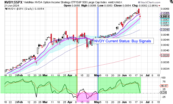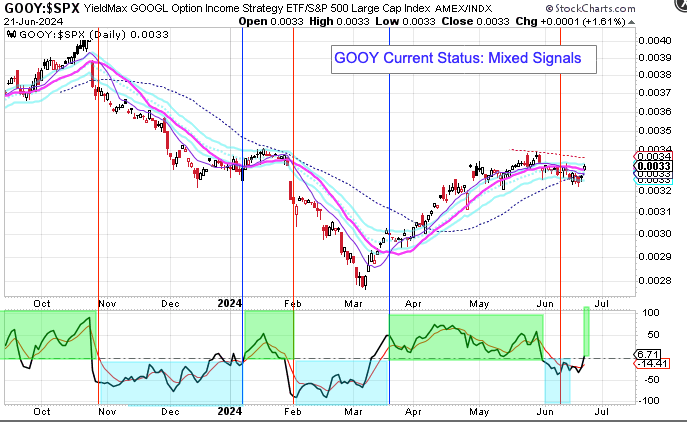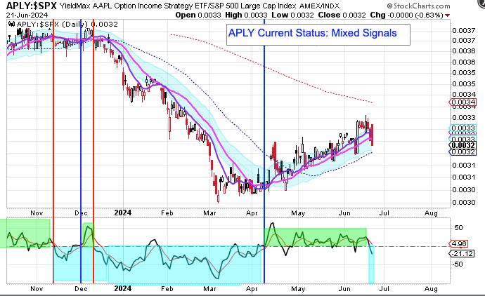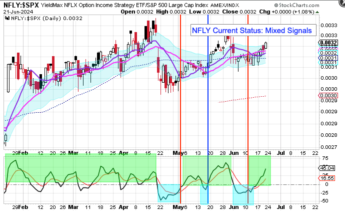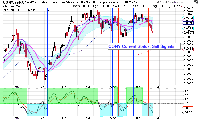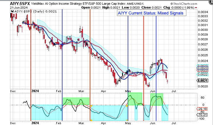 My YieldMax Rotation Strategy is to participate in the rallies and avoid the drawdowns. To do this I look at the different YieldMAX ETFs against the performance versus the SPY. Using a bullish/bearish crossover of the 10/20 MA’s as the buy/sell signal limits the downside drawdowns while participating in the capital appreciation and monthly distributions.