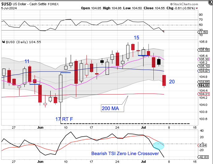 The dollar delivered bearish follow through on Friday by closing below the 50 day MA. to signal the daily cycle decline. The dollar also closed below the lower daily cycle band on Friday. Closing below the lower daily cycle band ends the daily uptrend and begins a daily downtrend. Closing below the lower daily cycle band also signals the intermediate cycle decline. We will be watching the 200 day MA for possible support for the DCL to form. More on this as we look at the weekly chart … which is discussed in the Weekend Report.