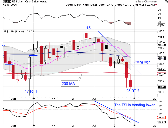 The dollar closed below the 200 day MA on Thursday then delivered bearish follow through on Friday. Friday was day 25, placing the dollar in its timing band for a DCL. A swing low and close back above the 200 day MA would signal the DCL. However, the dollar is currently in a daily downtrend. Forming a swing high below the upper daily cycle band indicates a continuation of its daily downtrend and signals a cycle band sell signal.