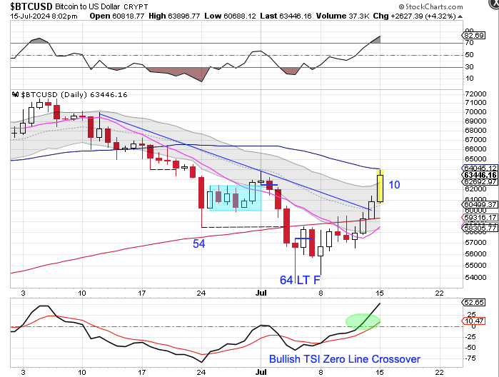 Bitcoin was making a series of lower highs and lower lows — until 7/05/24. That changed and Bitcoin began making a series of higher lows and higher highs, breaking out to a new July high on Monday.