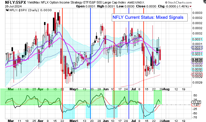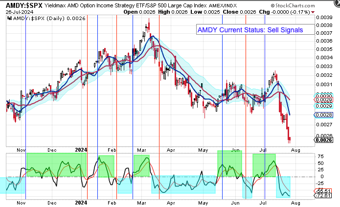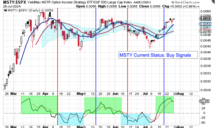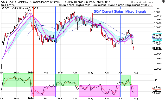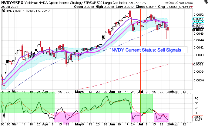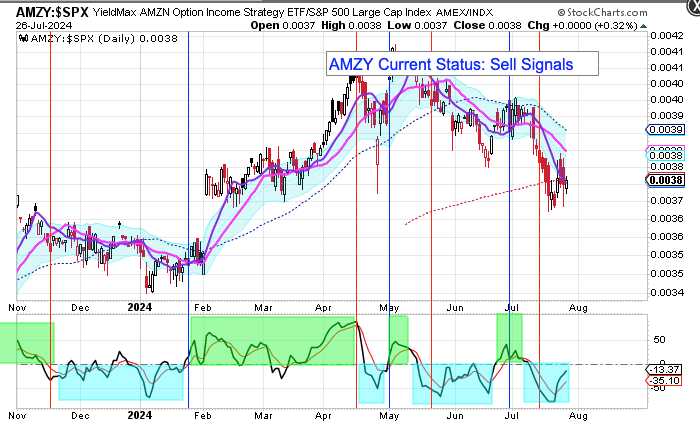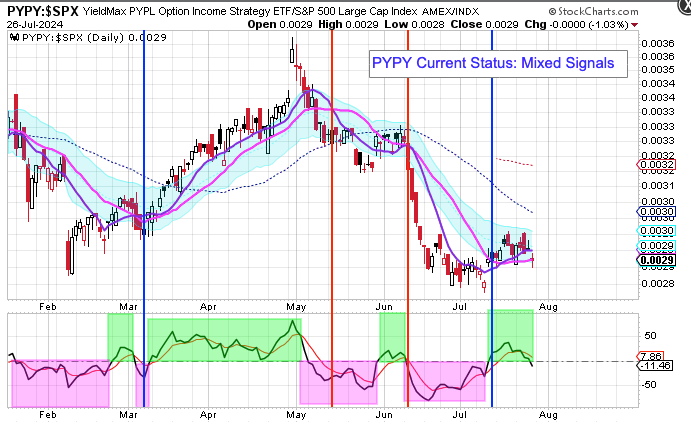 My YieldMax Rotation Strategy is to participate in the rallies and avoid the drawdowns. To do this I look at the different YieldMAX ETFs against the performance versus the SPY. Using a bullish/bearish crossover of the 10/20 MA’s as the buy/sell signal limits the downside drawdowns while participating in the capital appreciation and monthly distributions.