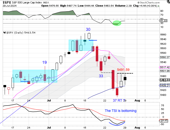 Stocks did not deliver any bearish follow through on Friday. Instead stocks closed back above the 50 day MA, which is the first indication that day 37 was the daily cycle low. While stocks backtested the 50 day MA on Monday, closing higher, we are looking for a swing low and a close above the 10 day MA to label day 37 as the DCL A break above 5491.59 will form a swing low. Stocks may be waiting for Wednesday’s FOMC meeting and Fed Chairman Powell comments before completing their DCL.