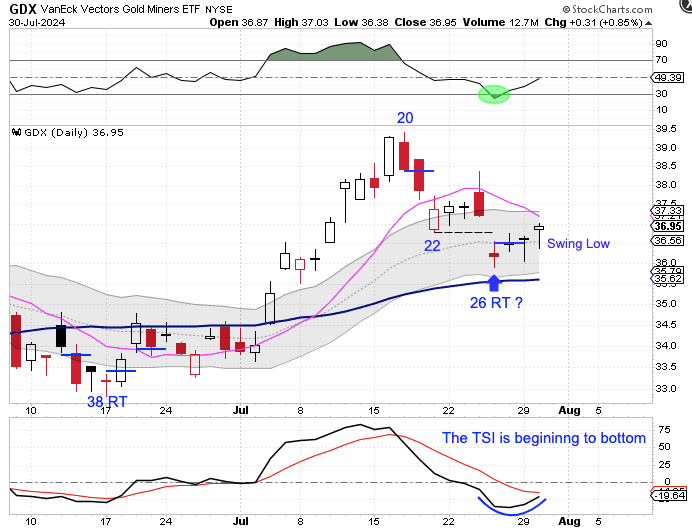 The Miners printed their lowest point on day 26, which is in the early part of its timing band for a DCL. Miners formed a swing low on Friday and then closed higher on Monday and Tuesday. The Miners are currently in a daily uptrend. A close back above the 10 day MA will indicate a continuation of their daily uptrend and signal a cycle band buy signal — which we would then label day 26 as the DCL.