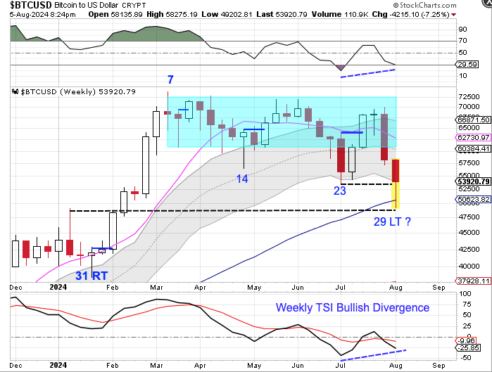 Bitcoin was down as much as 20 % over the weekend as it broke below the week 23 low over to extend its intermediate cycle decline. This is week 29, placing it in its timing band for an intermediate cycle low. Since Bitcoin has made a lower this week, the earliest it can form a weekly swing low will be next week. Bitcoin currently in a weekly uptrend is in the process of bouncing off a previous resistance level, along with the rising 50 week MA. If Bitcoin can form a swing low above the lower weekly cycle band and close back above the 10 week MA, that will indicate a continuation of its weekly uptrend and signal a weekly cycle band buy signal.