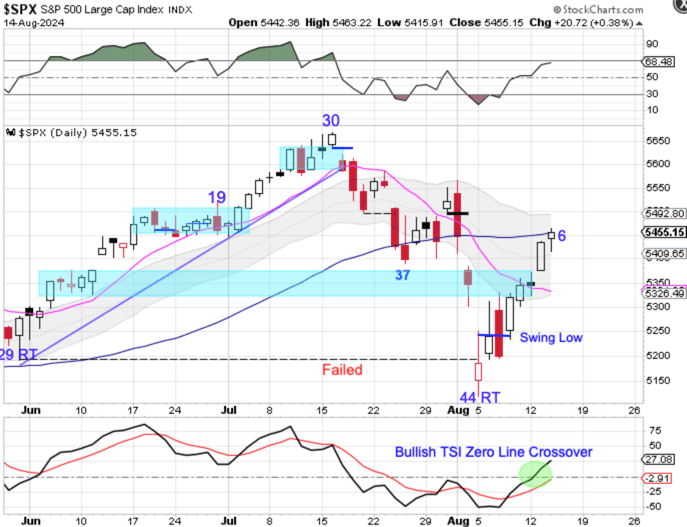 Stocks may need to consolidate to allow the 10 day MA to catch up to price. Stocks are currently in a daily downtrend. If stocks are rejected by the 50 day MA and close back below the 10 day MA that will indicate a continuation of its daily downtrend and signal a cycle band sell signal. That will also shift the odds that stocks are still declining into their intermediate cycle low. However, a close above the 50 day MA will begin to shift the odds that the day 44 daily cycle low was also an early ICL.