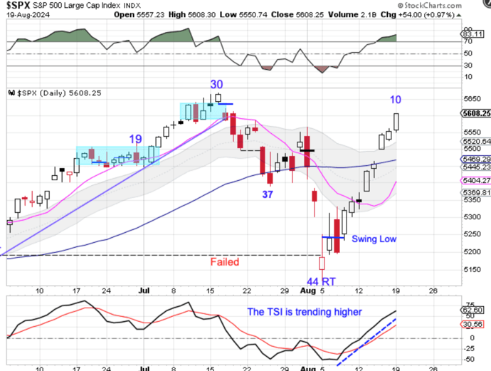 Stocks are now stretched above both the 50 day MA and the 10 day MA. Stocks will likely need to consolidate to allow the 10 day MA to catch up to price. Stocks are currently in a daily uptrend. Stocks will remain in their daily uptrend unless they close below the lower daily cycle band.