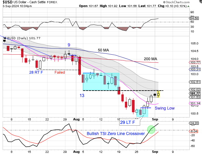 The dollar also broke above last week’s high forming a weekly swing low. In the Weekend Report I plan to discuss the longer term implications of the weekly swing low for the dollar’s intermediate (weekly) cycle and the longer term, yearly cycle.