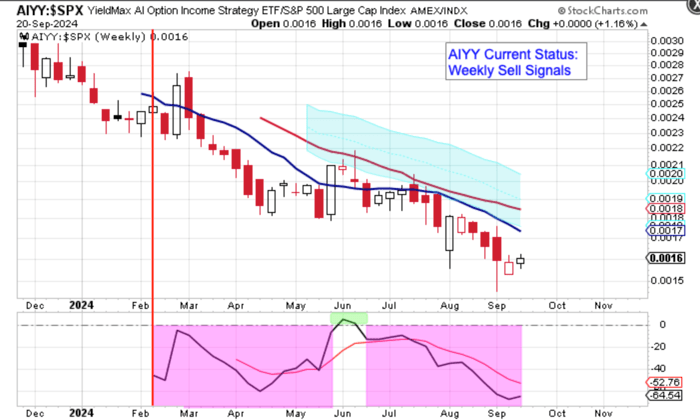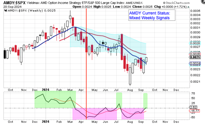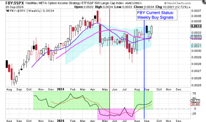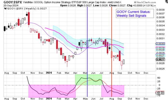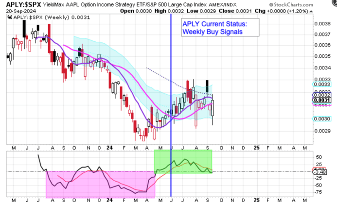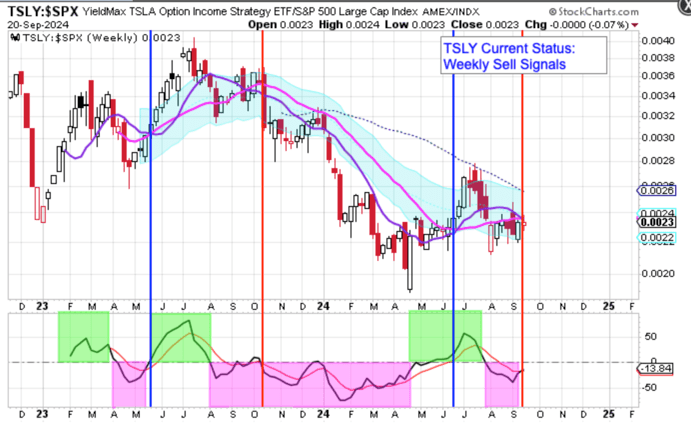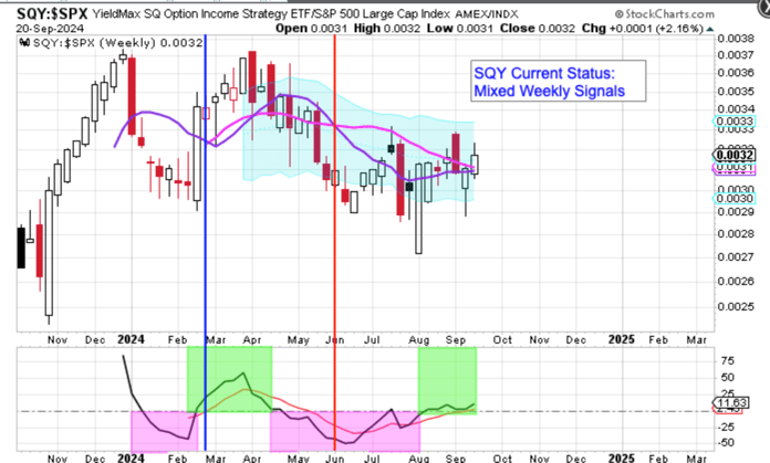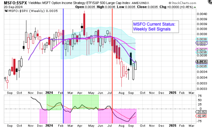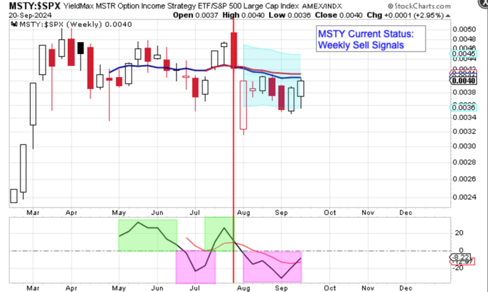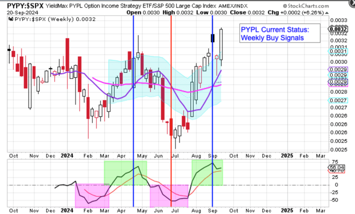 My YieldMax Rotation Strategy is to participate in the rallies and avoid the drawdowns. To do this I look at the different YieldMAX ETFs against the performance versus the SPY. Using a weekly chart with a bullish/bearish crossover of the 10/20 MA’s as the buy/sell signal limits the downside drawdowns while participating in the capital appreciation and monthly distributions.