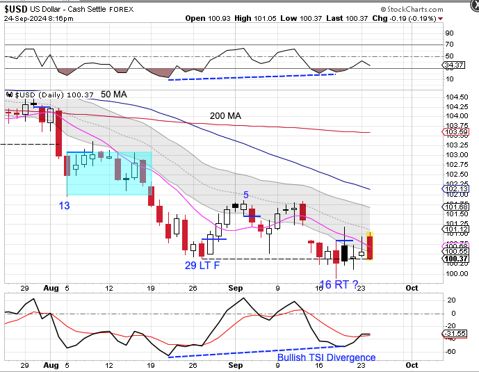 The dollar was rejected by the 10 day MA on Tuesday and is currently testing the 100.40 support level. A closed below the support level will indicate a continuation of its daily downtrend and signal a cycle band sell signal.