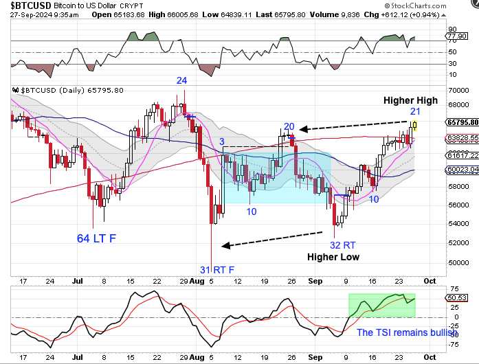 Bitcoin has broken the pattern of lower highs and lower lows and begun a new pattern of higher highs and higher lows. The expectation going forward is that pullbacks will be met with bull demand.