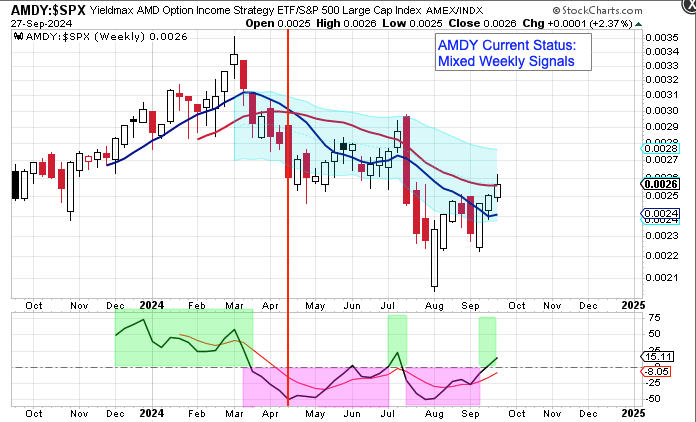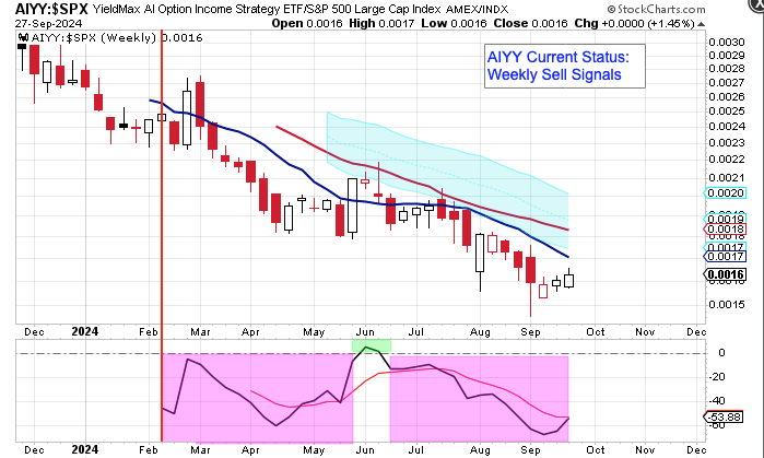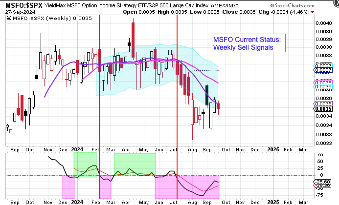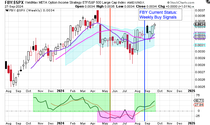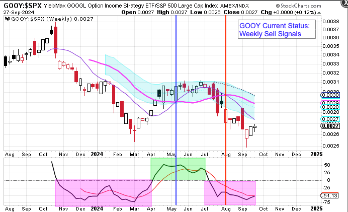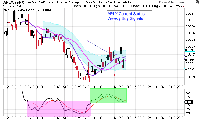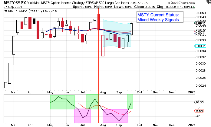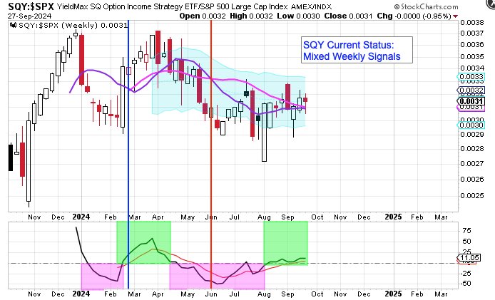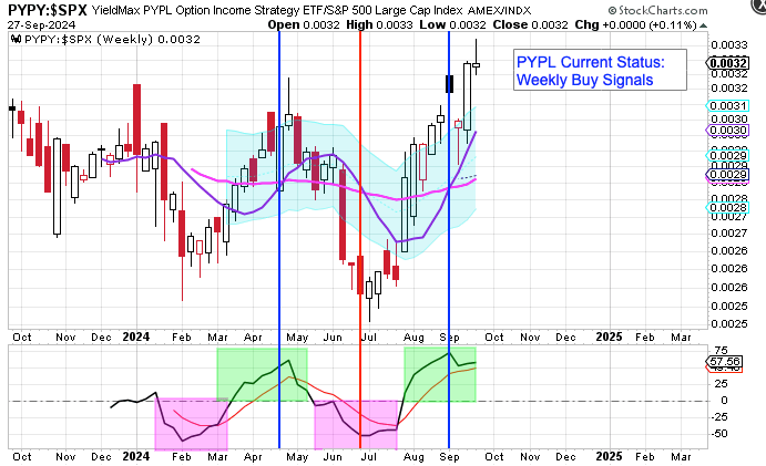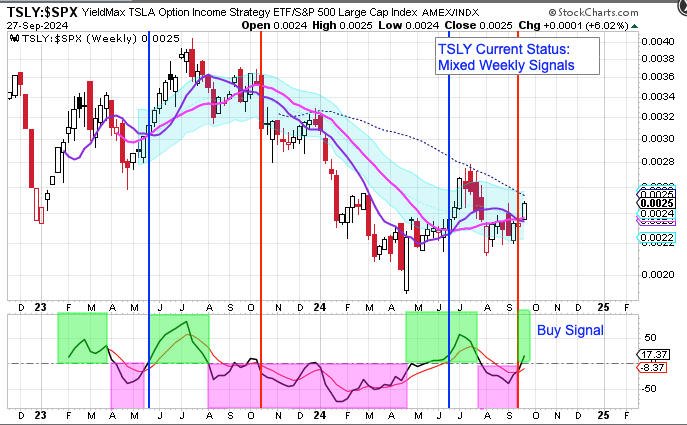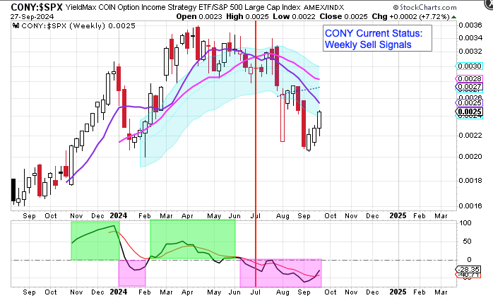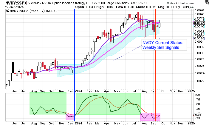 My YieldMax Rotation Strategy is to participate in the rallies and avoid the drawdowns. To do this I look at the different YieldMAX ETFs against the performance versus the SPY. Using a weekly chart with a bullish/bearish crossover of the 10/20 MA’s as the buy/sell signal limits the downside drawdowns while participating in the capital appreciation and monthly distributions.