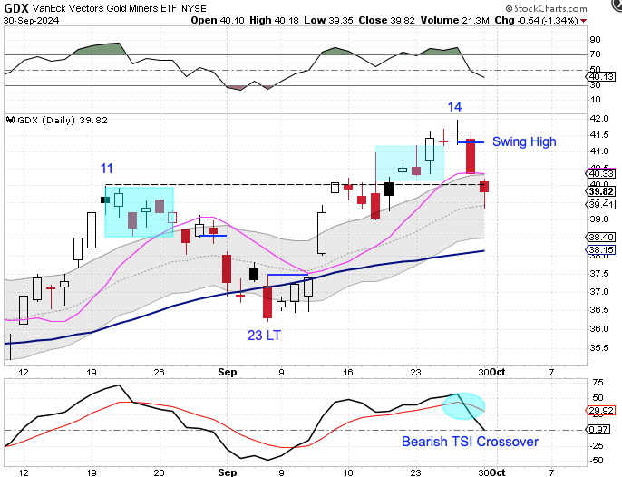 Last week we discussed that we would use a close below the resistance/support level as the stop. We will be watching the rising 50 day MA for possible support for a DCL to form. The Miners are currently in a daily uptrend. They will remain in their daily uptrend unless they close below the lower daily cycle band.