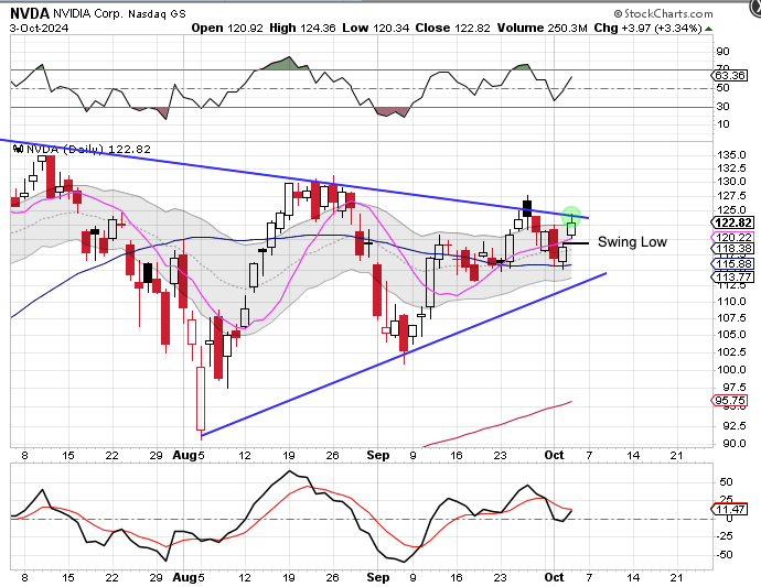 Instead, Nvidia retraced back down to the 50 day MA where it found support on Wednesday. Then it formed a swing low on Thursday and is back to retesting the upper stem of its triangle pattern. Nvidia is currently in a daily uptrend. If Nvidia delivers bullish follow through and closes above the declining trend line that will indicate a continuation of its daily uptrend and signal a cycle band buy signal.