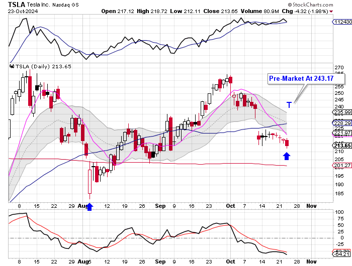 Tesla Bulls are pleased and has Tesla trading at 243.17 in the pre-market, forming an island reversal. Assuming the Tesla closes at or near this level would have Tesla close above the upper daily cycle band. Closing above the upper daily cycle band ends the daily downtrend and begins a daily uptrend.