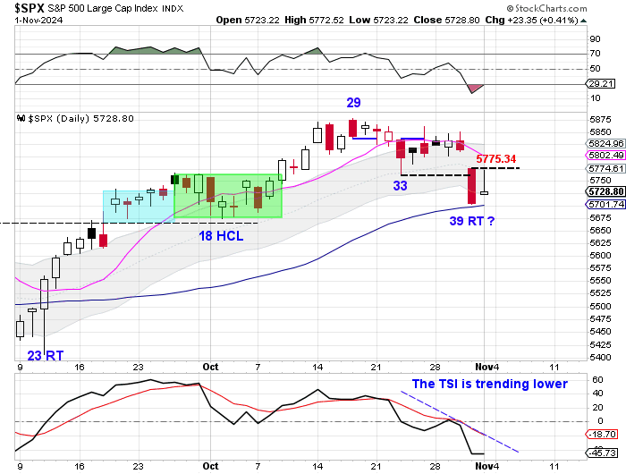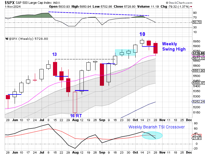 The first signal was stocks closing below the lower daily cycle band on Thursday. Closing below the lower daily cycle band ends the daily uptrend and begins a daily downtrend. Closing below the lower daily cycle band also signals the intermediate cycle decline has started.