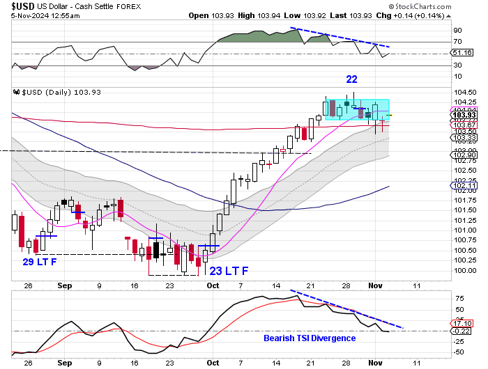 Monday was day 26, placing the dollar in its timing and for a daily cycle low. The dollar should complete its daily cycle decline over the next 5 to 10 days, which should help stocks to rally once stocks complete their daily cycle decline. However, the longer term picture for the dollar is bullish. I believe that the dollar is rallying into a new yearly cycle, which I discussed in the Weekend Report. Once the dollar completes its DCL and rallies into a new daily cycle, that should provide a strong headwind for stocks and may help to send stocks into their intermediate cycle decline. Other reasons why the stage is set for an intermediate cycle decline can be found in my Special Report, The Stage Is Set.
