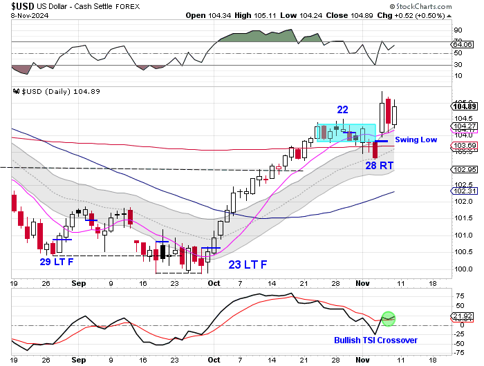 Wednesday’s swing low closed back above both the 10 day MA and the 200 day MA. With the dollar being in a daily uptrend, Wednesday’s price action signaled a new daily cycle.