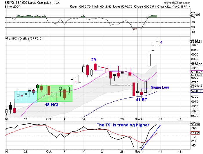 Stocks found support at the rising 50 day MA and formed a swing low on Tuesday. Stocks closed above the 10 day MA on Wednesday then delivered bullish follow through Thursday and Friday – breaking out to new all-time highs — again.