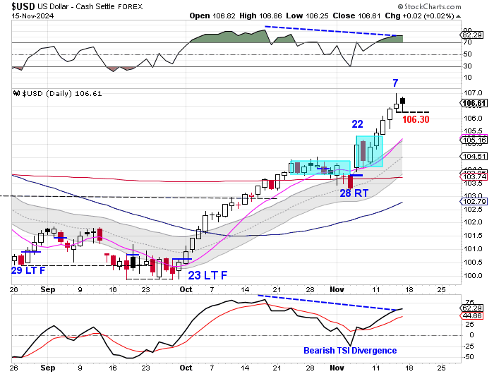 The Dollar will likely need to consolidate which would help to allow the 10 day MA time to catch up to price. But a swing high and a close below the 10 day MA will signal the daily cycle decline. A break below 106.30 will form a swing high. The dollar is currently in a daily uptrend. The dollar will remain in its daily uptrend unless it closes below the lower daily band.