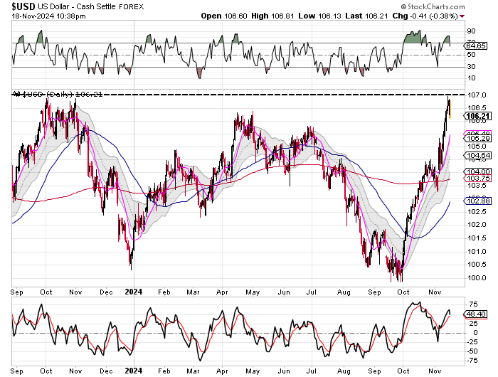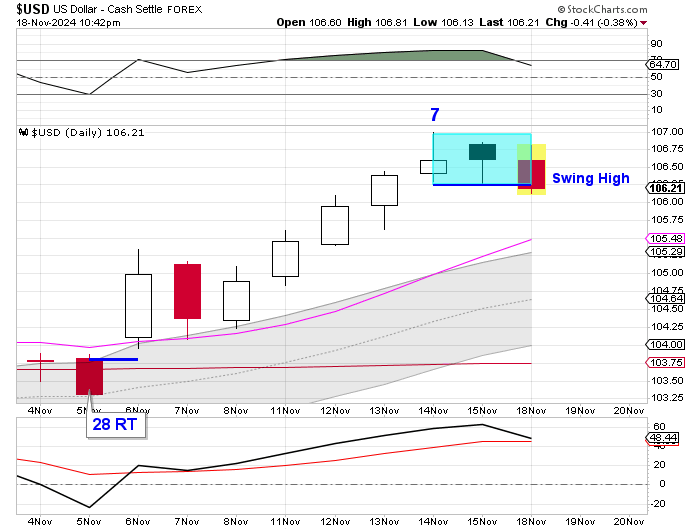 The dollar is in the process of breaking bearishly out of consolidation. A close below the 10 day MA will signal the daily cycle decline. The dollar is currently in a daily uptrend. The dollar will remain in its daily uptrend unless it closes below the lower daily band.