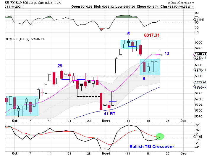 Stocks are currently in a daily uptrend. Closing back above the 10 day MA indicates a continuation of their daily uptrend and signals a cycle band buy signal. A break above the day 5 high of 6017.31 will assure us of a right translated daily cycle formation.