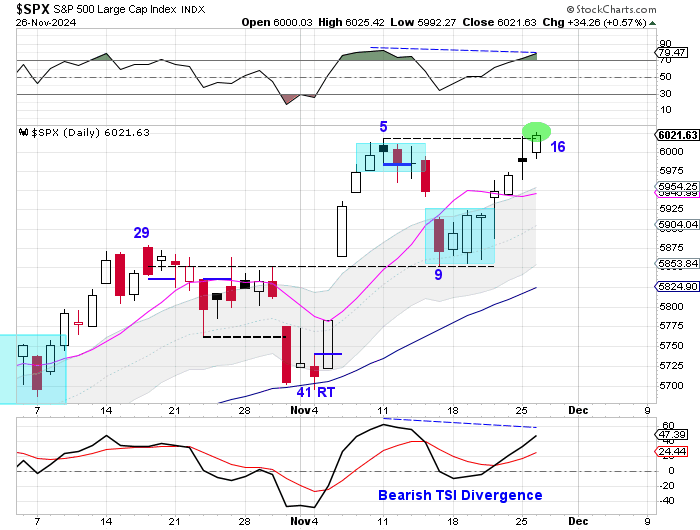 Stocks are stretched above the 10 day MA. Stocks may need to consolidate to allow the 10 day MA time to catch up to price. Stocks are currently in a daily uptrend. If stocks deliver bullish follow through that will indicate a continuation of their daily uptrend and signal a cycle band buy signal.