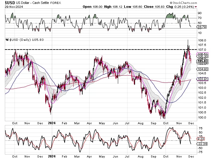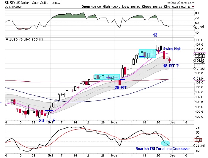 The dollar delivered bearish follow through on Wednesday, closing below the 10 day MA to signal the daily cycle decline. The dollar went on to close lower again on Friday. The dollar is currently in a daily uptrend. The dollar will remain in its daily uptrend unless it closes below the lower daily cycle band.
