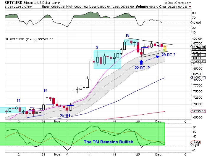 Bitcoin printed its lowest point on day 22, placing it in the early part of its timing band for a DCL. Bitcoin formed a swing low last Wednesday that closed back above the 10 day MA to signal day 22 as an early DCL. Then Bitcoin closed below the 10 day MA on Monday, calling into question if day 22 was the DCL.