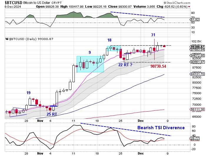 Despite Thursday’s volatility, BTC remains in consolidation. A break below the day 22 low of 90730.54 will extend the daily cycle decline. BTC is currently in a daily uptrend. A close above the 100000 level will indicate a continuation of its daily uptrend and signal a cycle band buy signal — in which we will label day 22 as the DCL.