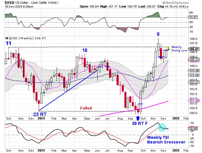 The dollar formed a weekly swing low last week. With the dollar rallying into its new daily cycle, we need to turn our attention to the 107 resistance level. Rejection by the 107 resistance level would signal the intermediate cycle decline. However, the dollar is currently in a weekly uptrend. A close back above the 107 resistance level would indicate a continuation of its weekly uptrend and signal a weekly cycle band buy signal.