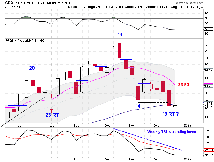 Last week was week 19. That places the Miners in their timing band for an ICL. A close above the 50 week MA will signal a new intermediate cycle. We would need to wait for a close above the 10 week MA to label week 19 as the ICL. However, long positions could be entered with a close above the 50 week MA with a stop being placed below the 50 week MA.