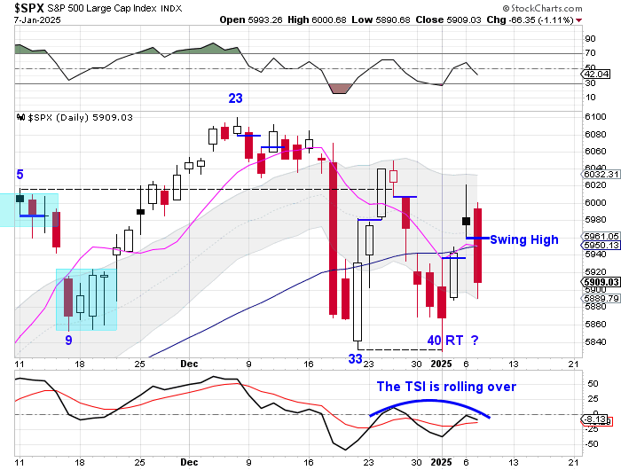 Stocks printed their lowest point on day 40, placing them deep in their timing band for a daily cycle low. Stocks formed a swing low on Friday then closed above both the 10 day MA and the 50 day MA on Monday, turning the 10 day MA higher, to signal day 40 as the DCL. However, Tuesday’s swing high calls this into question. What is clear is that stocks are currently in a daily downtrend. Forming a swing high below the upper daily cycle band indicates a continuation of its daily downtrend and signals a cycle band sell signal. Any bearish follow through will likely negate the weekly swing low that formed on Monday and extend the intermediate (weekly) cycle decline.