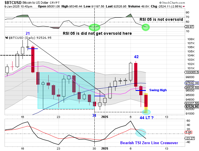 You will notice that RSI 05 did not get oversold when Bitcoin printed its day 34 low. Bitcoin has had a lot of support around the 91 – 92000 level over the past month and RSI 05 is currently not oversold. A bullish reversal on RSI 05 would signal that Thursday was day 44 of an extend daily cycle. We would then look for a swing low and a close above the 10 day MA to label day 44 as the DCL.