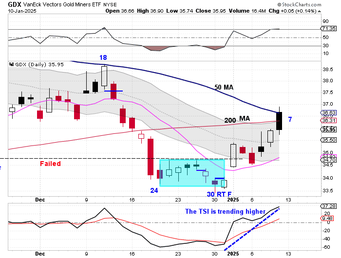 The Miners broke above the converging 50 day MA and the 200 day MA on Friday, but was unable to close above them.