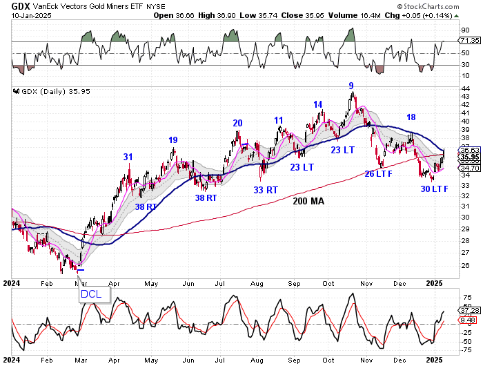 Above is a daily chart for the past year. No trending move will be established until the Miners close above both of the 200 day MA and the 50 day MA.