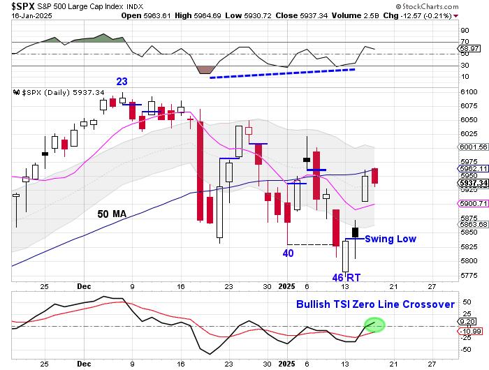 Stocks ran into resistance at the 50 day MA on Thursday. Stocks are also a bit stretched above the 10 day MA. Stocks may need to consolidate to allow the 10 day MA time to catch up to price. Stocks are currently in a daily downtrend. But a close above the upper daily cycle band will end the daily downtrend and being a new daily uptrend.