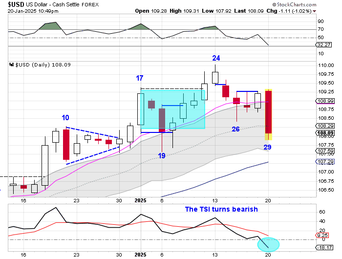 Monday was day 29, placing the dollar in its timing band for a daily cycle low. The dollar should turn the 10 day MA lower in order to complete its daily cycle decline. We will be watching the rising 50 day MA for possible support for the DCL to form. The dollar is currently in a daily uptrend. But a close below the lower daily cycle band will ends its daily uptrend and begin a daily downtrend. A close below the lower daily cycle band will also signal the intermediate cycle decline — which I plan to address in the Weekend Report.