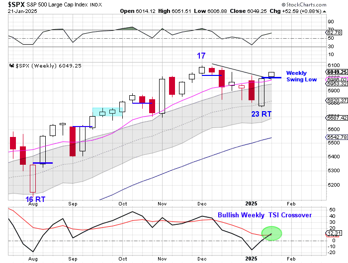 Stocks are in the process of forming a weekly swing low and breaking above the declining weekly trend line. Stocks should have turned the 10 week MA lower in order to complete their intermediate cycle decline. However, stocks did not turn the 10 week MA lower at the previous ICL and it appears that it will not do so again. Stocks are currently in a weekly uptrend. A close above the declining weekly trend line will indicate a continuation of its weekly uptrend and signal a weekly cycle band buy signal — in which we will label week 23 as the ICL.