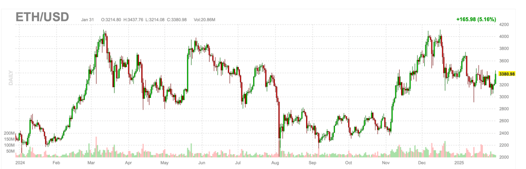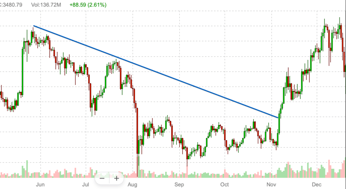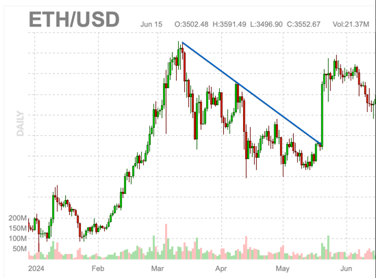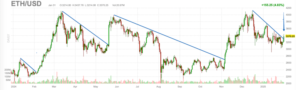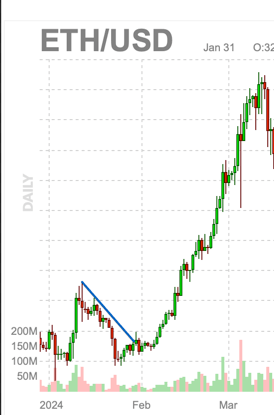 Ethereum rallied into early January. The had a sharp drop off towards the end of January. But once it broke above the declining trend line – it was off to the races.