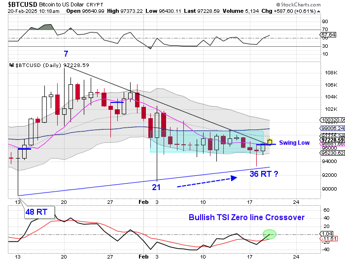 Bitcoin is in the process of breaking above the declining trend line this morning. Sometimes the cycle low will migrate to the apex of the consolidation pattern. Bitcoin is still in a daily uptrend. A bullish break out of consolidation with a close back above the 50 day MA will indicate a continuation of its daily uptrend and signal a cycle band buy signal — in which we would then label day 36 as the DCL.