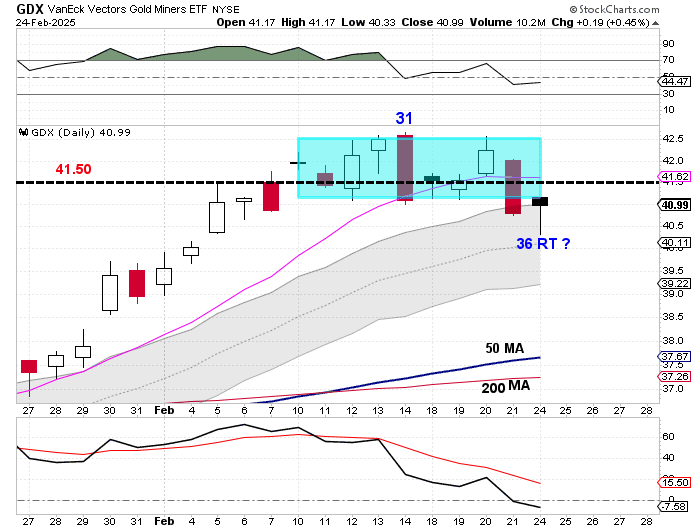 The Miners closed below the previous 41.50 resistance level and the 10 day MA on Friday to signal the daily cycle decline.