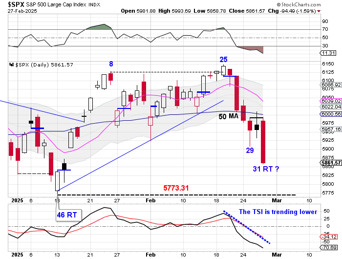 Stocks were rejected by the 50 day MA and broke below the day 29 low on Thursday to extend the daily cycle decline. Stocks are currently run a daily downtrend. Rejection by the 50 day MA indicates a continuation of its daily downtrend and signals a cycle band sell signal. A break below the previous DCL of 5773.31 will form a failed daily cycle.