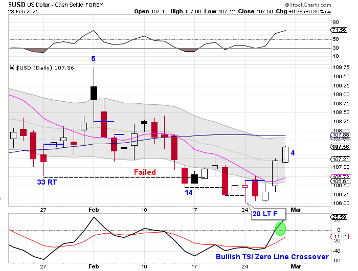 The dollar formed a swing low on Tuesday. The dollar delivered bullish follow through on Thursday, closing above the 10 day MA to signal day 20 as the DCL. The dollar went on to close higher on Friday, turning the 10 day MA higher. The dollar is still in a daily downtrend. But a close above the upper daily cycle band will end its daily downtrend and begin a new daily uptrend.