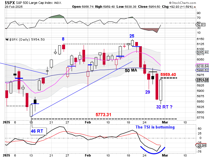 Stocks ran into resistance at the 50 day MA on Wednesday. Stocks were rejected by the 50 day MA and broke below the day 29 low on Thursday to extend the daily cycle decline. Stocks went on to print a lower low on Friday. Friday was day 32, placing stocks in their timing band for a daily cycle low. Stocks formed a bullish reversal on Friday, which eases the parameters for forming a swing low. A break above 5959.40 will form a swing low. Then a close above the converging 50 day MA and the 10 day MA will signal the new daily cycle. Stocks are currently in a daily downtrend. Stocks will remain its daily downtrend unless they close above the upper daily cycle band.