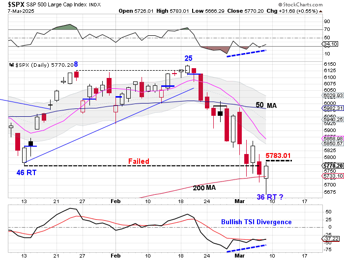 Breaking below the previous daily cycle low forms a failed daily cycle and extends the intermediate cycle decline. Thursday was day 36, placing stocks in their timing band for a DCL. However, stocks found support at the 200 day MA and formed a bullish reversal on Friday. Friday was day 37, placing in stocks in their timing band for a daily cycle low. A break above 5783.01 will form a swing low. Then they close above the 10 day MA will signal the new daily cycle. Stocks are currently in the daily downtrend. Stocks will remain in their daily downtrend unless they close above the upper daily cycle band