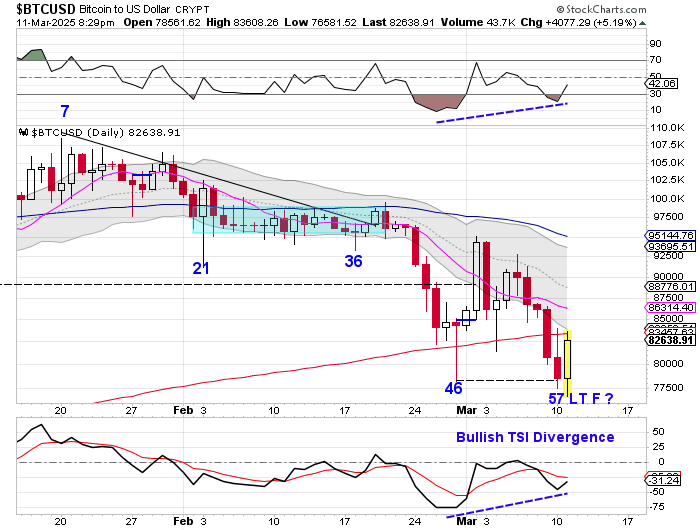 Bitcoin broke below the day 46 low on Monday. Since the rally out of the day 46 low did not manage to turn the 10 day MA higher, breaking below the day 46 low extended to daily cycle decline. Bitcoin went on to print a lower low on Tuesday, day 57, which places bitcoin very deep and its timing band for a daily cycle low. There are bullish divergences developing on the oscillators. And bitcoin is in the process of forming a bullish reversal, which will ease the parameters performing a swing low. If bitcoin forms a swing low and closes above the converging 200 day MA and 10 day MA then we will label day 57 as the daily cycle low.