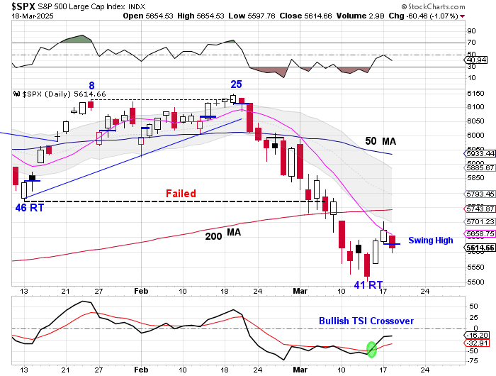 The decline into the day 41 low caused the 10 day MA to drop sharply. While I still think that day 41 marks the DCL, stocks will need to close above the 10 day MA and turn it higher as it rallies out off the day 41 low. And then nothing easy — there will still be the 200 day MA and the 50 day MA that will act as dynamic resistance.