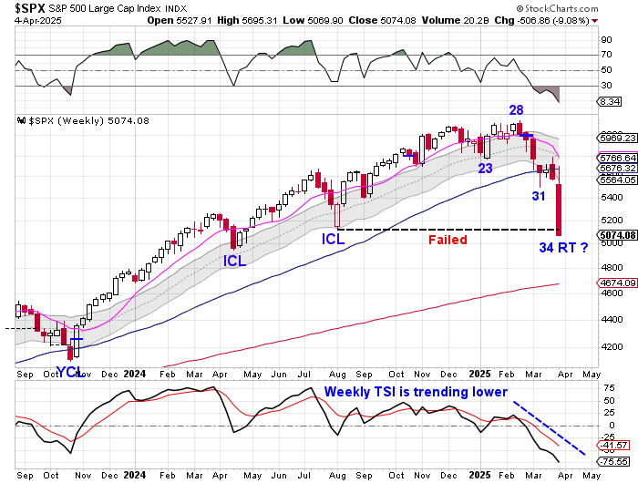 Stocks closed back below the 50 week MA the previous week and delivered bearish follow through this week, closing 9.08% lower ! In the past 7 weeks stocks erased the gains from the preceding 7 months. Stocks broke below the previous ICL this week to form a failed intermediate cycle, which signals the yearly cycle decline.