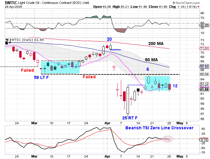Oil ran into resistance at the 65 level on day 6. Oil has since been consolidating below the 65 level and above the 10 day MA — until Monday. Oil closed below the 10 day MA on Monday. Oil is currently in a daily downtrend. Closing below the 10 day MA indicates a continuation of its daily downtrend and signals a cycle band sell signal.